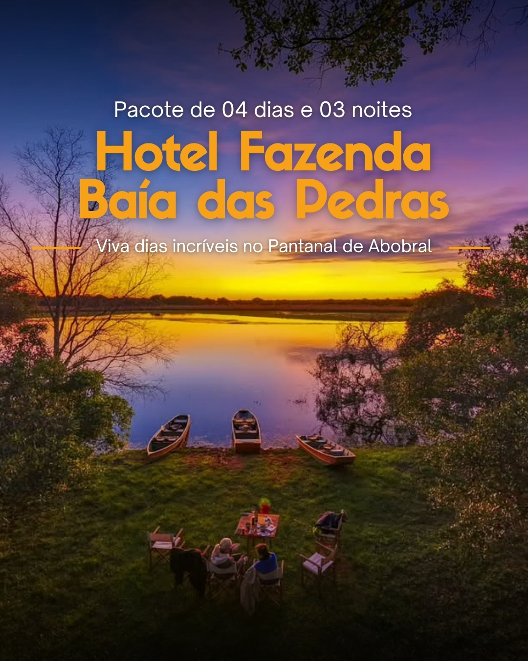 Prepare-se para viver dias de imersão total no coração do Pantanal, onde a natureza dita o ritmo e cada momento se transforma em uma experiência inesquecível. No Hotel Fazenda Baía das Pedras, você será convidado a explorar paisagens únicas, observar a vida selvagem de perto e sentir a essência do bioma em cada detalhe, do nascer ao pôr do sol.