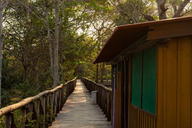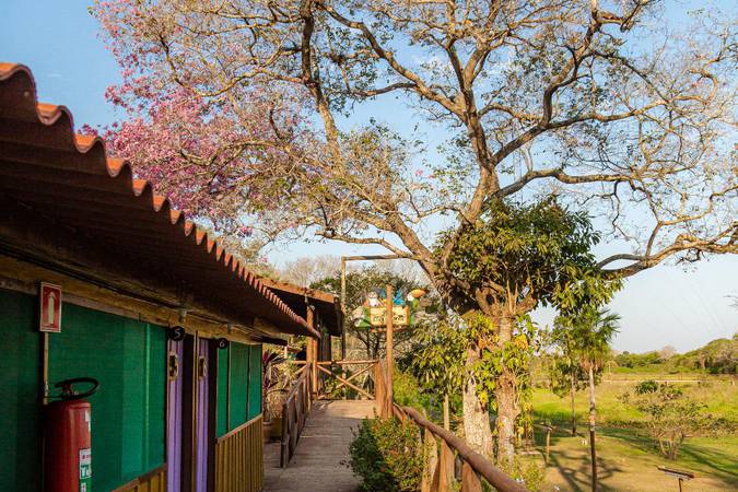 A pousada fica às margens do Rio Miranda, e foi construída em madeira sobre palafitas para integrar-se perfeitamente ao ambiente e também ao ciclo das águas, típico do ecossistema pantaneiro.