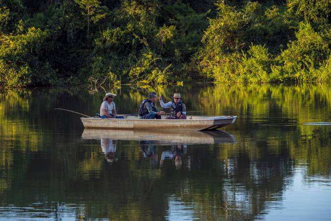 A pesca de piranhas é uma experiência que acontece na Baía das Ariranhas, um local deslumbrante, berçário de peixes e habitado por famílias de ariranhas.