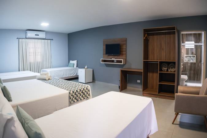 Os quartos em estilo rústico-chique são amplos, arejados e iluminados, e contam com todas as comodidades necessárias para uma estadia confortável e relaxante para toda família. O hotel ainda conta com piscina ao ar livre, jardins e café da manhã delicioso!